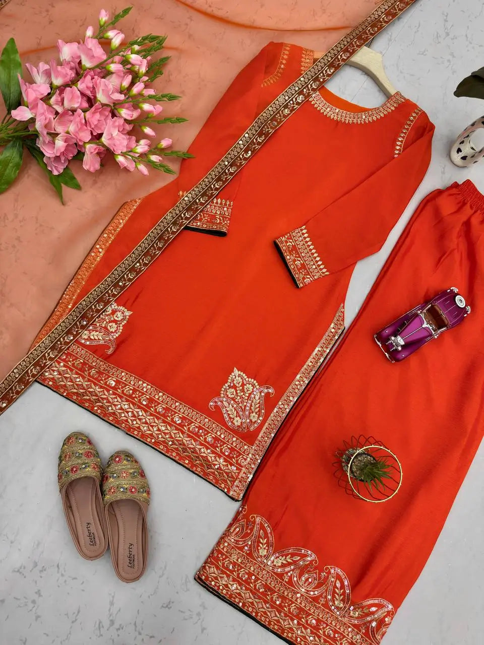This ensemble includes a 2.2-meter pure Chinon silk dupatta beautifully adorned with matching embroidery, sequin, and zari work along with a fancy lace border for a sophisticated finish. The set is completed with a fully stitched free-size Chinon silk pant, combining effortless comfort with opulent style. Ready to wear and beautifully tailored, this outfit embodies understated luxury and grace.