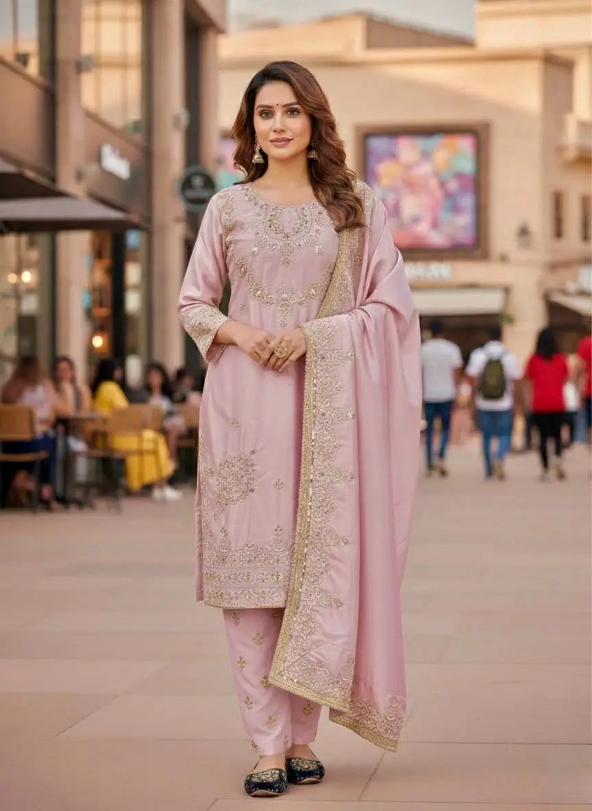 This elegant suit set is made from pure natural crepe silk, offering a smooth texture and a comfortable drape. The top features detailed embroidery and sequence work that adds a refined festive look, while the full sleeves keep the silhouette graceful and modest. It comes with a soft micro cotton inner for all-day comfort and a neatly stitched finish.