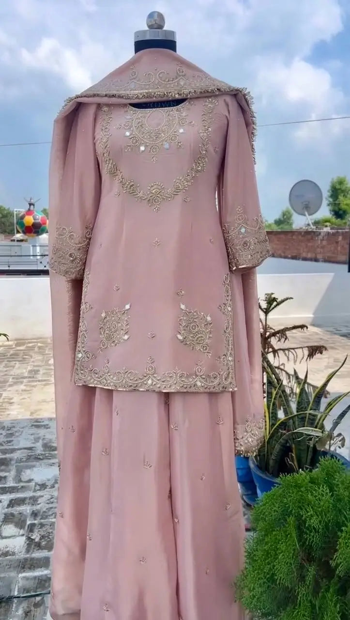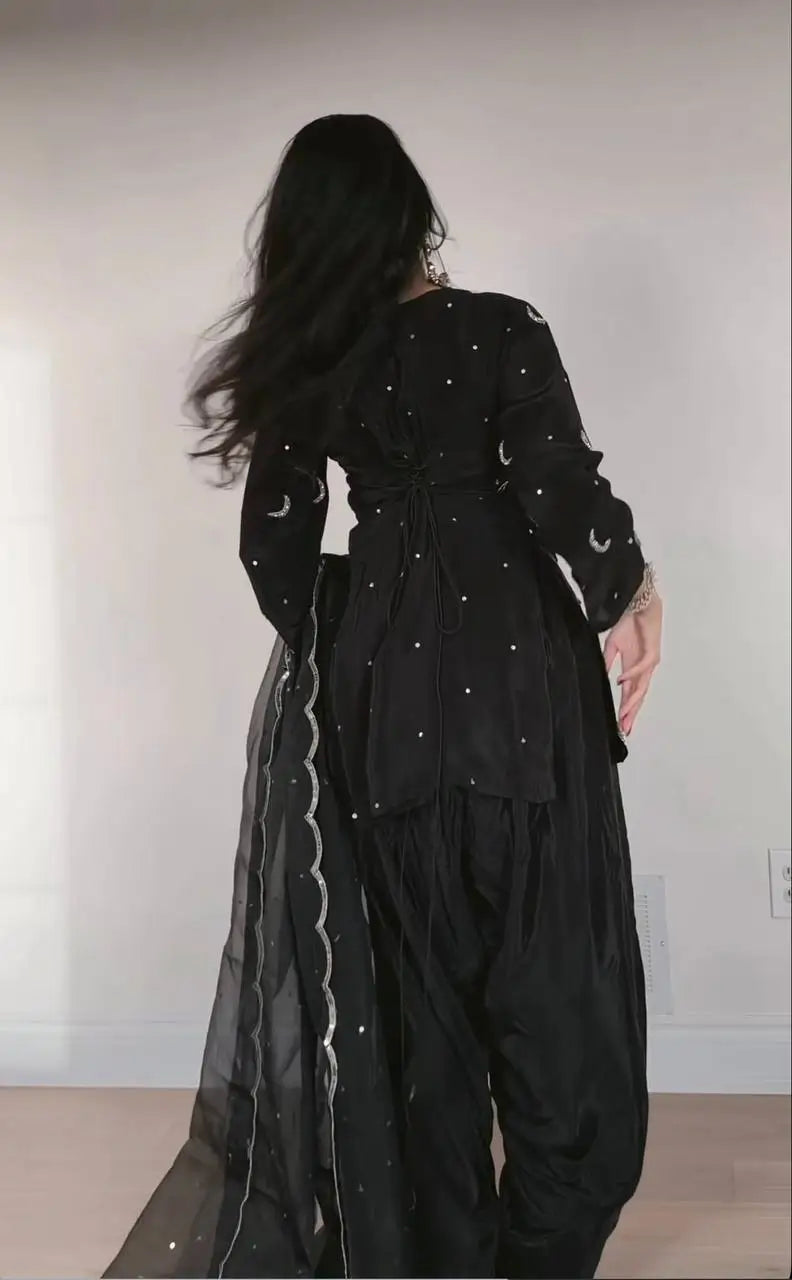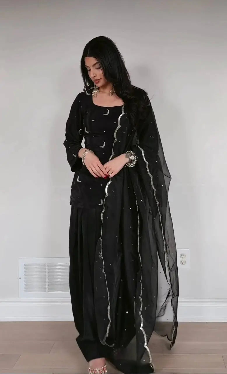 The matching pant is crafted from the same crepe silk fabric with coordinated embroidery and a comfortable elastic waistband. The soft organza silk dupatta completes the outfit with delicate sequence embroidery, lace edging, and patta detailing. This fully stitched set is perfect for festive gatherings, family functions, and special occasions that call for a polished and graceful appearance.