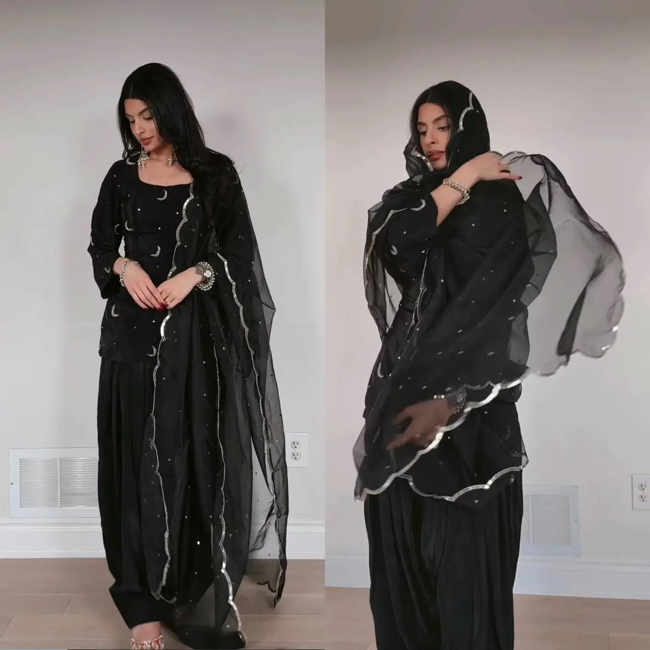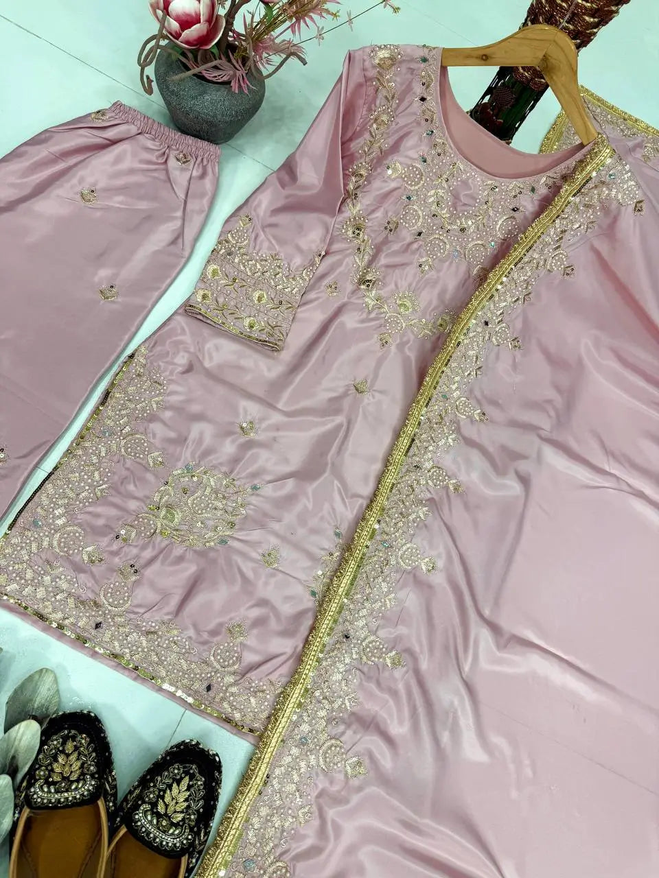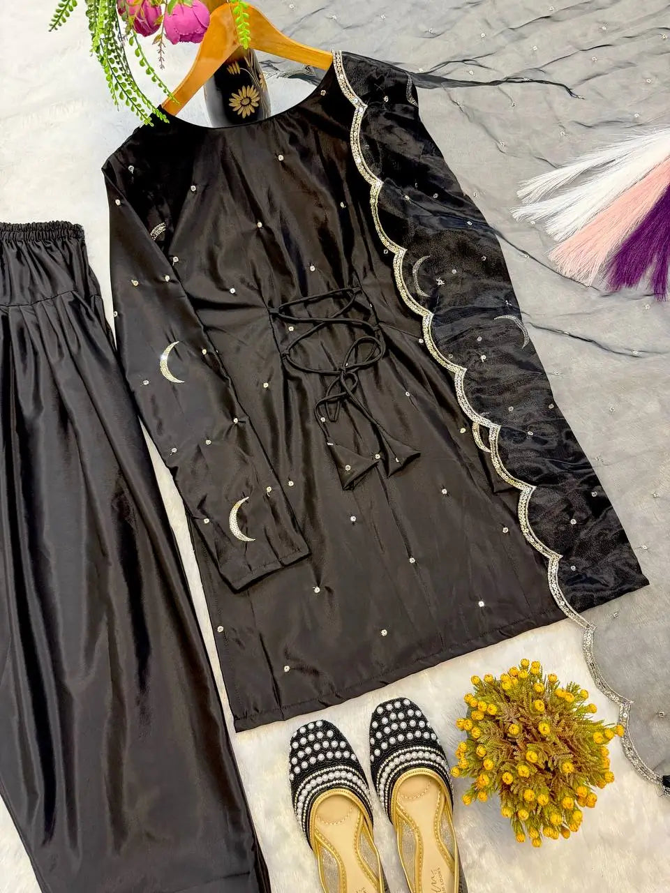 The matching pant is crafted from the same crepe silk fabric with coordinated embroidery and a comfortable elastic waistband. The soft organza silk dupatta completes the outfit with delicate sequence embroidery, lace edging, and patta detailing. This fully stitched set is perfect for festive gatherings, family functions, and special occasions that call for a polished and graceful appearance.