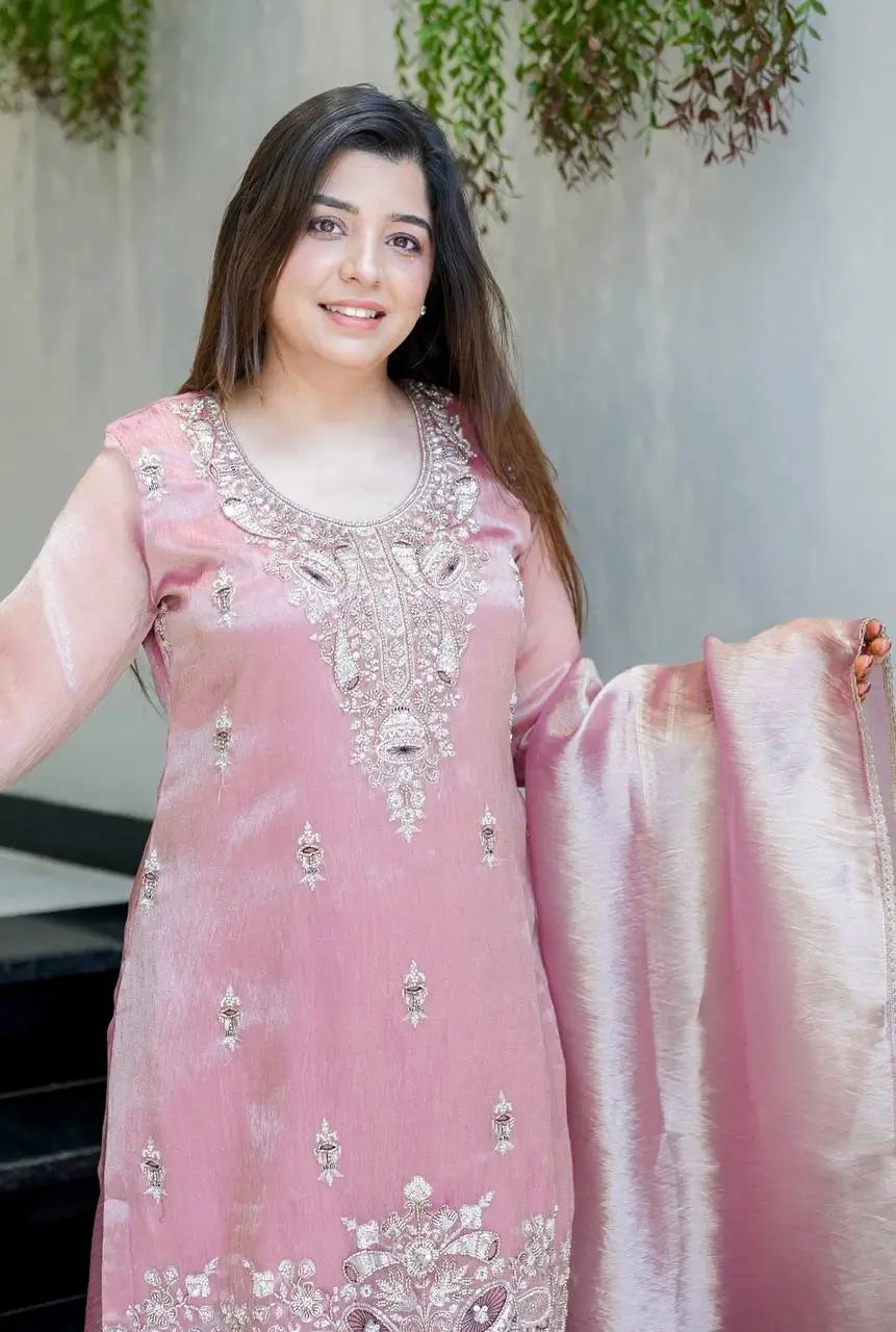 This elegant suit set is crafted from pure  silk, offering a rich sheen and luxurious drape. The top features delicate embroidery and sequence work across the neckline, sleeves, and hem, paired with a soft heavy micro cotton inner for comfort throughout the day.