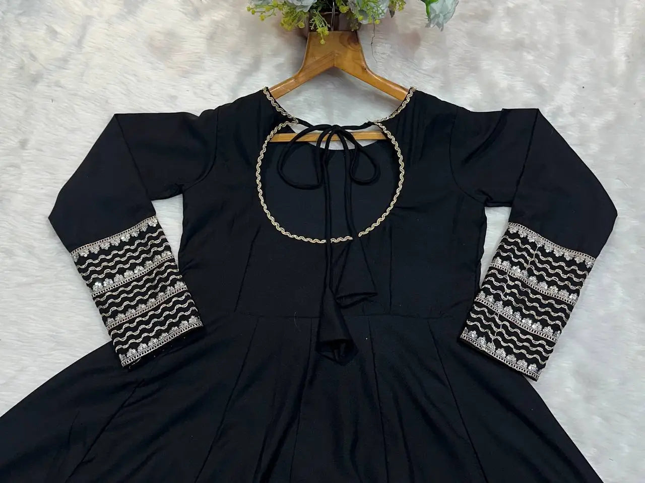 Step into timeless elegance with this beautifully crafted gown set designed for festive and wedding occasions. The gown is made from soft rayon fabric and enhanced with heavy cording embroidery, sequins, and detailed thread work that creates a rich and graceful look. The kali cut pattern adds volume and flow, giving the outfit a regal silhouette. For maximum comfort, the gown features a full cotton lining from top to bottom, making it suitable for long hours of wear. It is paired with a fully stitched heavy micro cotton pant that ensures ease of movement and a neat finish. Completing the ensemble is a faux georgette dupatta adorned with cording embroidery, lace detailing, and zari work, adding a refined traditional touch.
