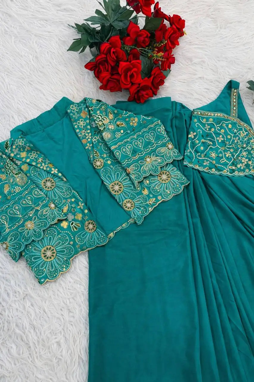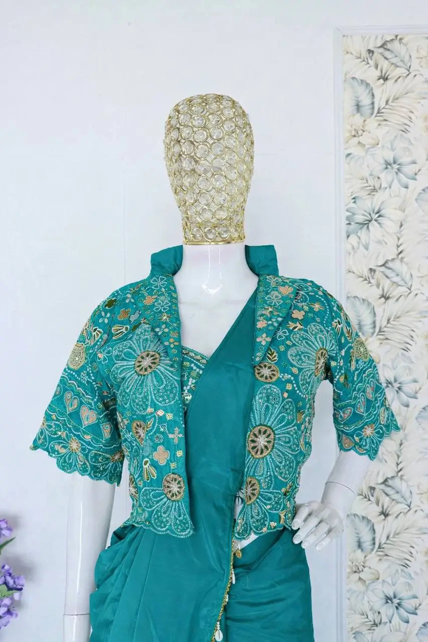 Elevate your festive and occasion wear collection with this elegant ready to wear saree set crafted in heavy crepe silk. The saree features a refined lace border that adds subtle sophistication while ensuring a graceful drape. Paired with a fully stitched embroidered jacket designed with sequence work, this ensemble brings a modern layered look with traditional charm. The matching blouse is crafted from heavy crepe silk and enhanced with multi thread embroidery and sequence detailing, creating a coordinated and premium finish. Designed for effortless styling and comfort, this set is ideal for weddings, festive celebrations, and elegant evening occasions.