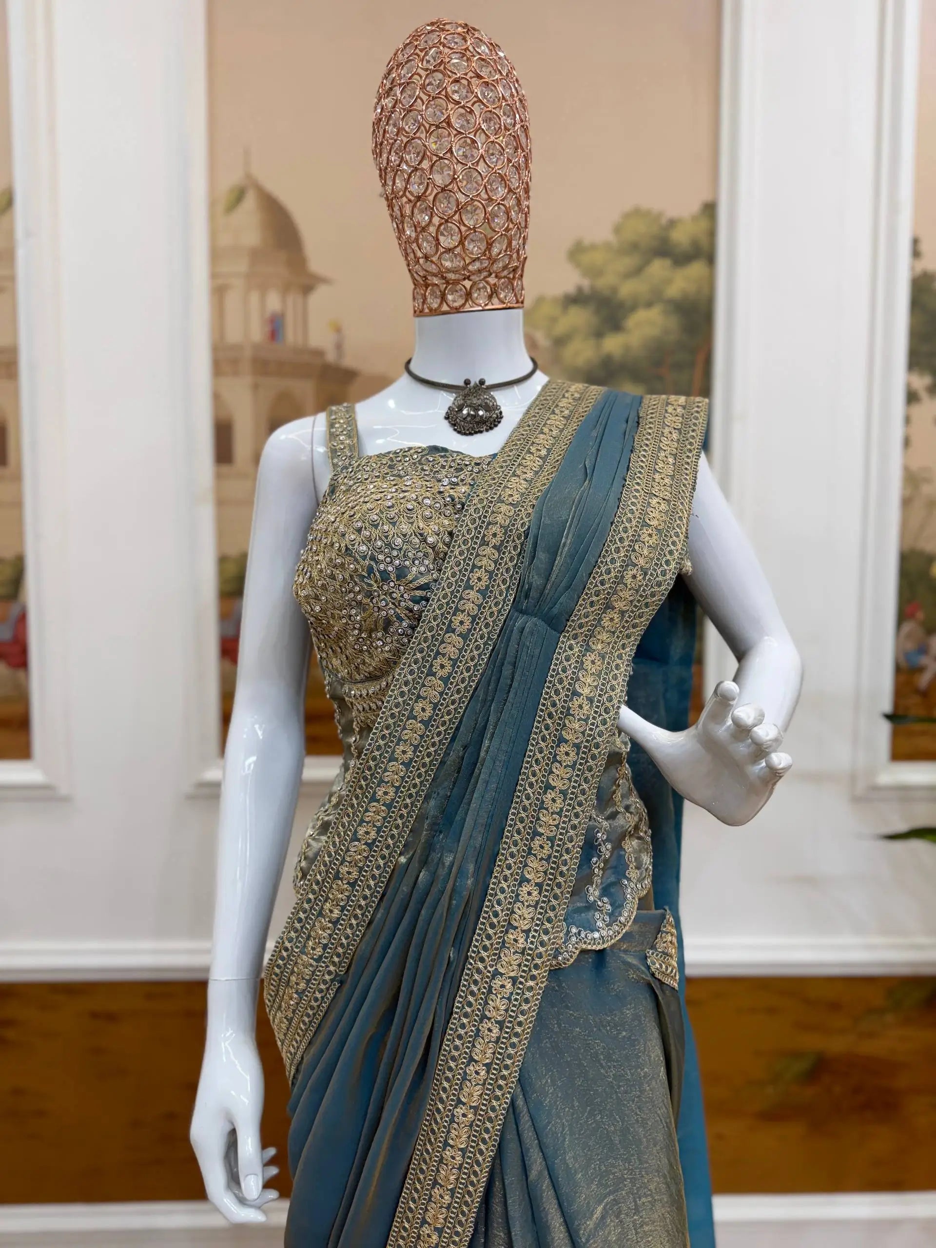 Make an elegant statement with this premium ready to wear saree crafted from rich fandy satin. Designed for effortless styling, the saree features a graceful dual tone finish enhanced with a finely detailed embroidery lace border that adds a refined festive touch. The smooth satin drape offers a flattering fall and luxurious feel, perfect for special occasions. Paired with a fully stitched fandy satin blouse, adorned with intricate full embroidery and hand work, this ensemble delivers boutique quality elegance with modern convenience. Ideal for weddings, parties, and festive celebrations, this saree set combines comfort, craftsmanship, and timeless style.