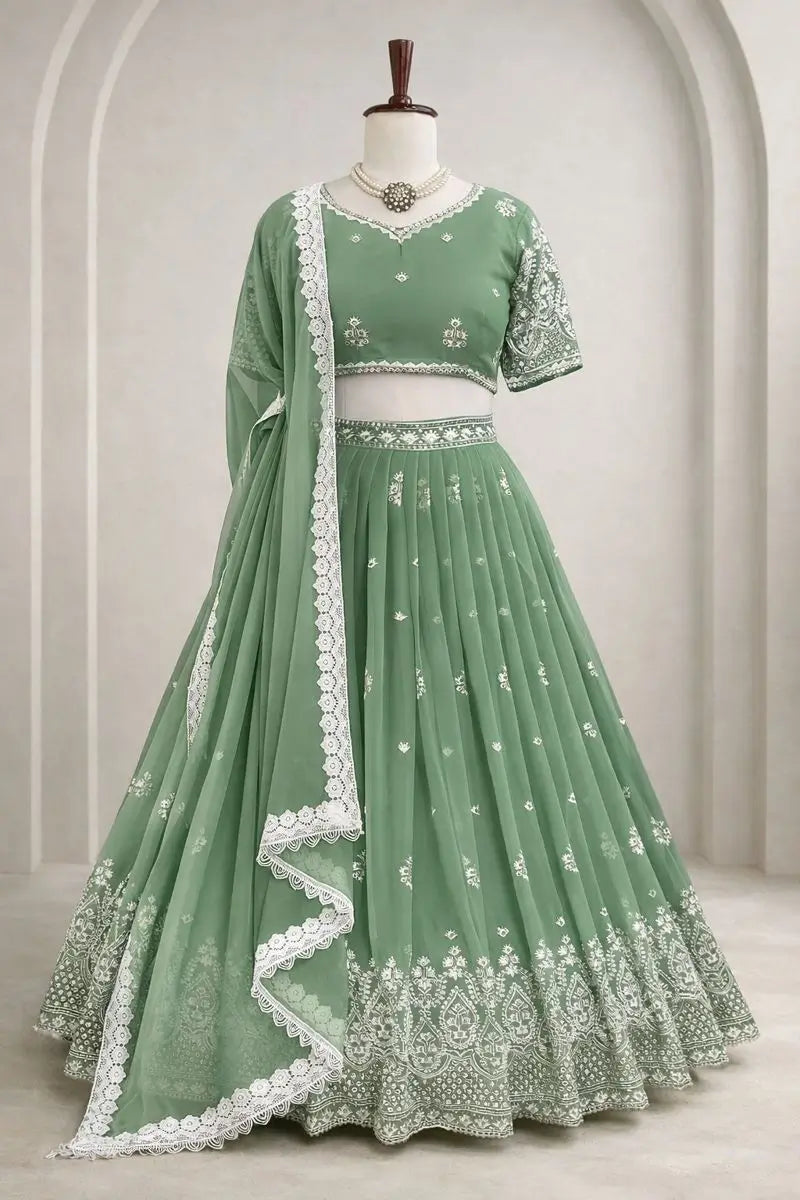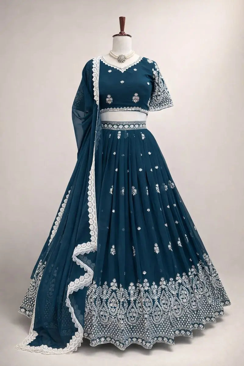 The lehenga is crafted from premium faux georgette fabric, beautifully decorated with thread embroidery and heavy 9mm sequin work, creating a rich shimmer effect that photographs beautifully under lights. For a grand bridal-style fall, it comes with soft micro lining along with cancan and canvas support, which gives the skirt volume and a royal flare.