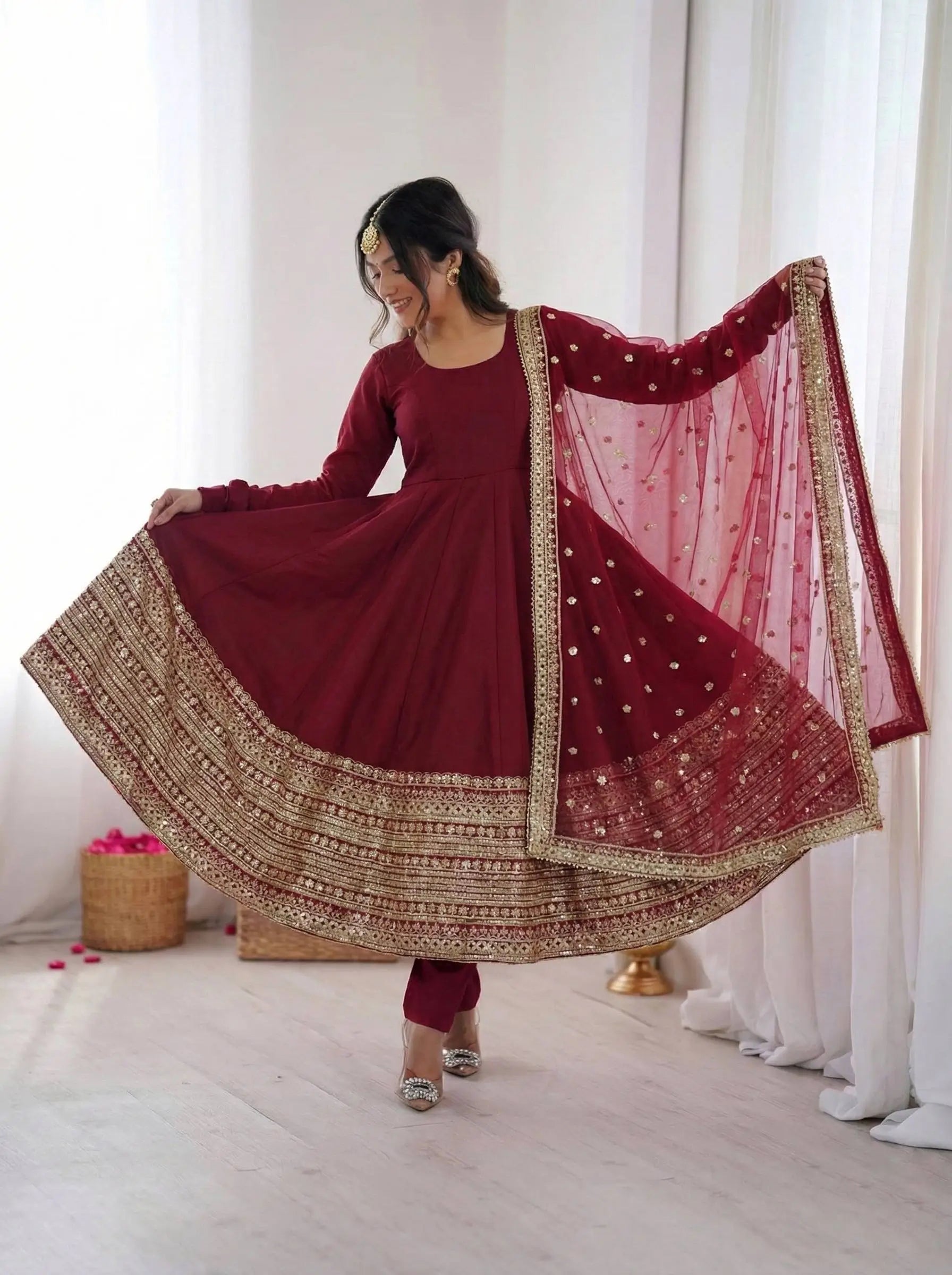 Make a graceful statement with this premium ready to wear Anarkali gown set crafted from elegant Roman silk. Designed with beautiful cording sequence embroidery, the gown offers a rich festive appeal while maintaining all day comfort through its heavy micro cotton inner. The flowing Anarkali silhouette features a generous 3.70 meter flair that enhances movement and elegance. Paired with a comfortable natural crepe bottom and a heavy net dupatta detailed with embroidery and a readymade lace border, this ensemble is perfect for weddings, festive occasions, and special celebrations. Finished with showroom quality stitching, this set is ideal for women who appreciate traditional elegance with modern comfort.