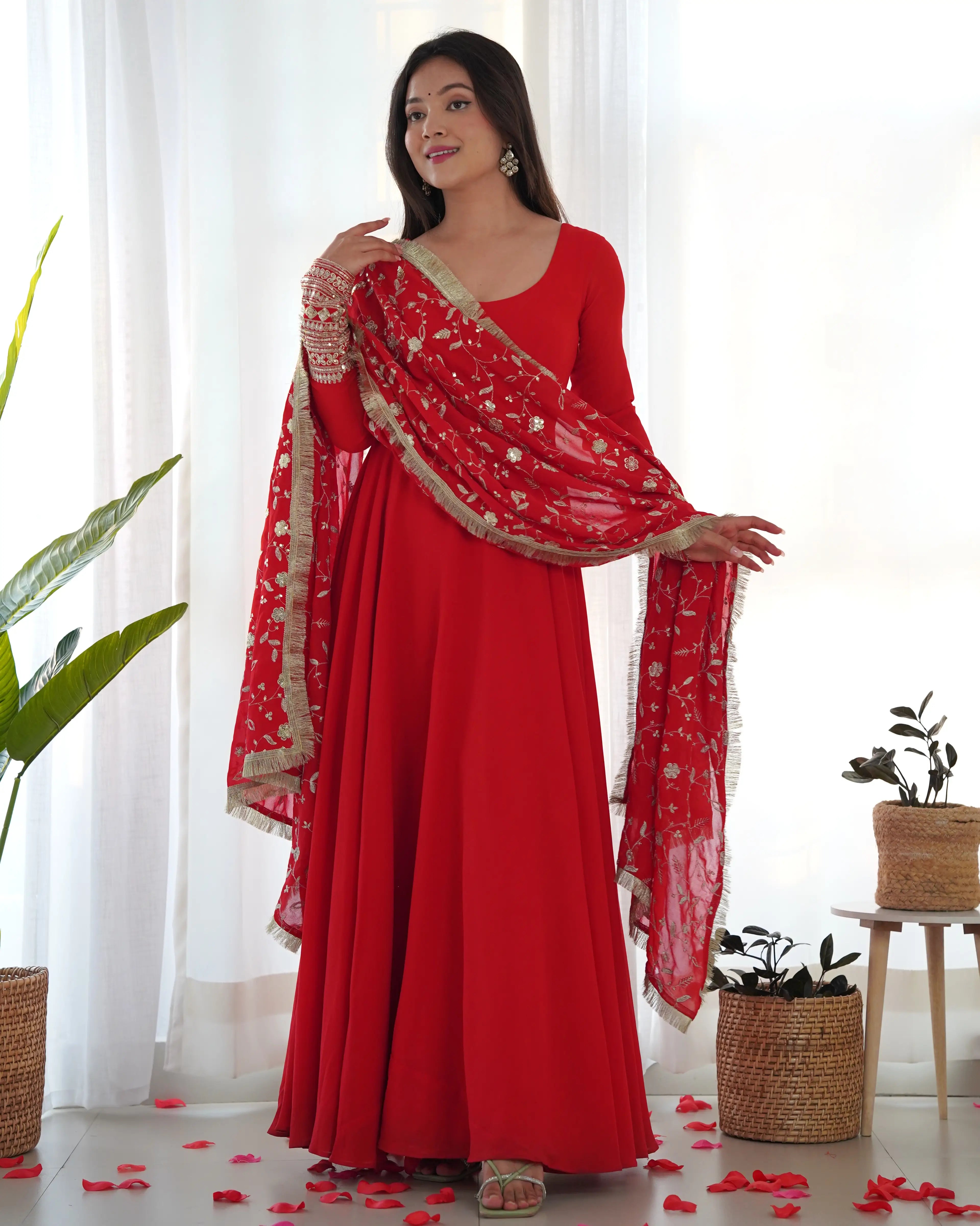 Elevate your festive wardrobe with this regal Anarkali set, beautifully crafted from heavy pure soft fox georgette. The gown showcases an impressive 7-meter plus flair that flows gracefully, creating a royal silhouette perfect for grand celebrations. The yoke features elegant potli button detailing with built-in padding for a structured look, while the full sleeves are adorned with intricate sequins and zari embroidery for an exquisite touch.