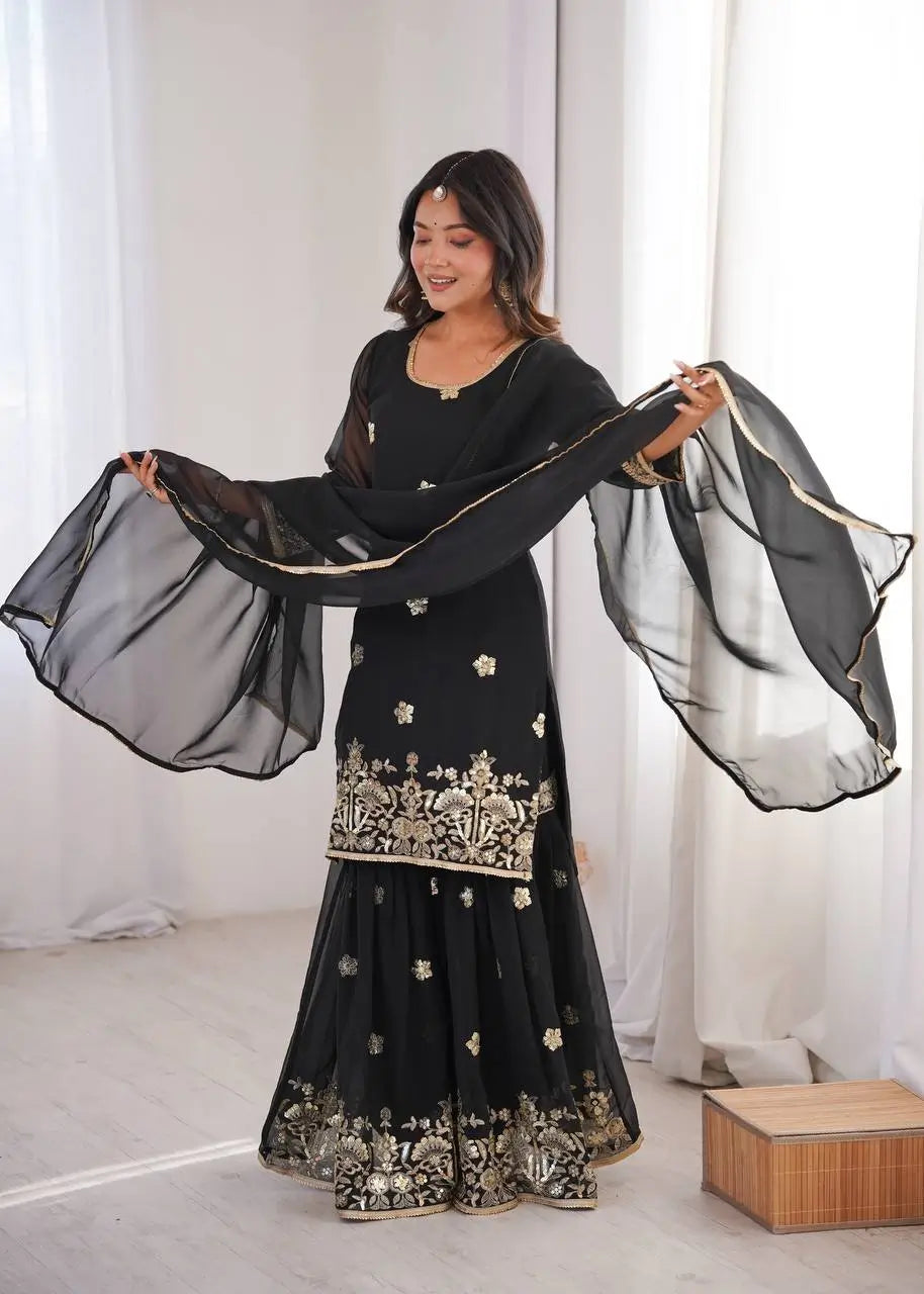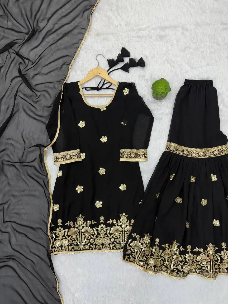 Elevate your wedding and festive style with this elegant sharara set designed for a graceful and refined look. The top is crafted from flowy georgette fabric and adorned with delicate sequins embroidery that adds subtle sparkle and festive charm. It comes with a soft micro cotton inner to ensure comfort and ease throughout long celebrations. The matching sharara, made from georgette with a micro cotton inner, offers a beautiful flare and effortless movement. Completing the ensemble is a coordinated georgette dupatta that enhances the overall elegance. Fully stitched and ready to wear, this set is a perfect choice for weddings, festive functions, and special occasions.