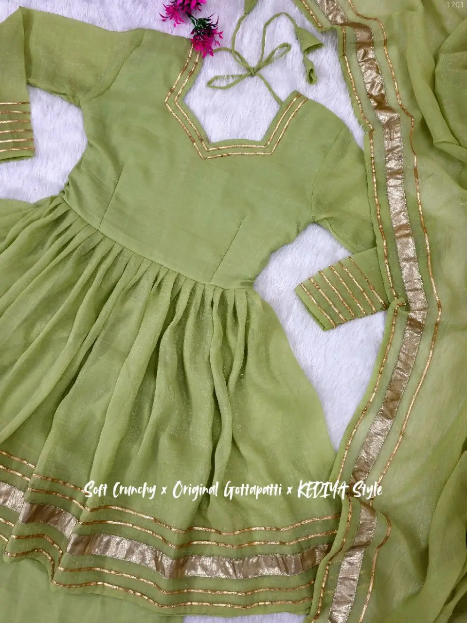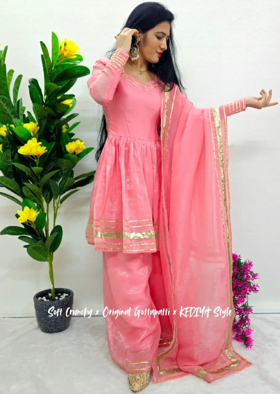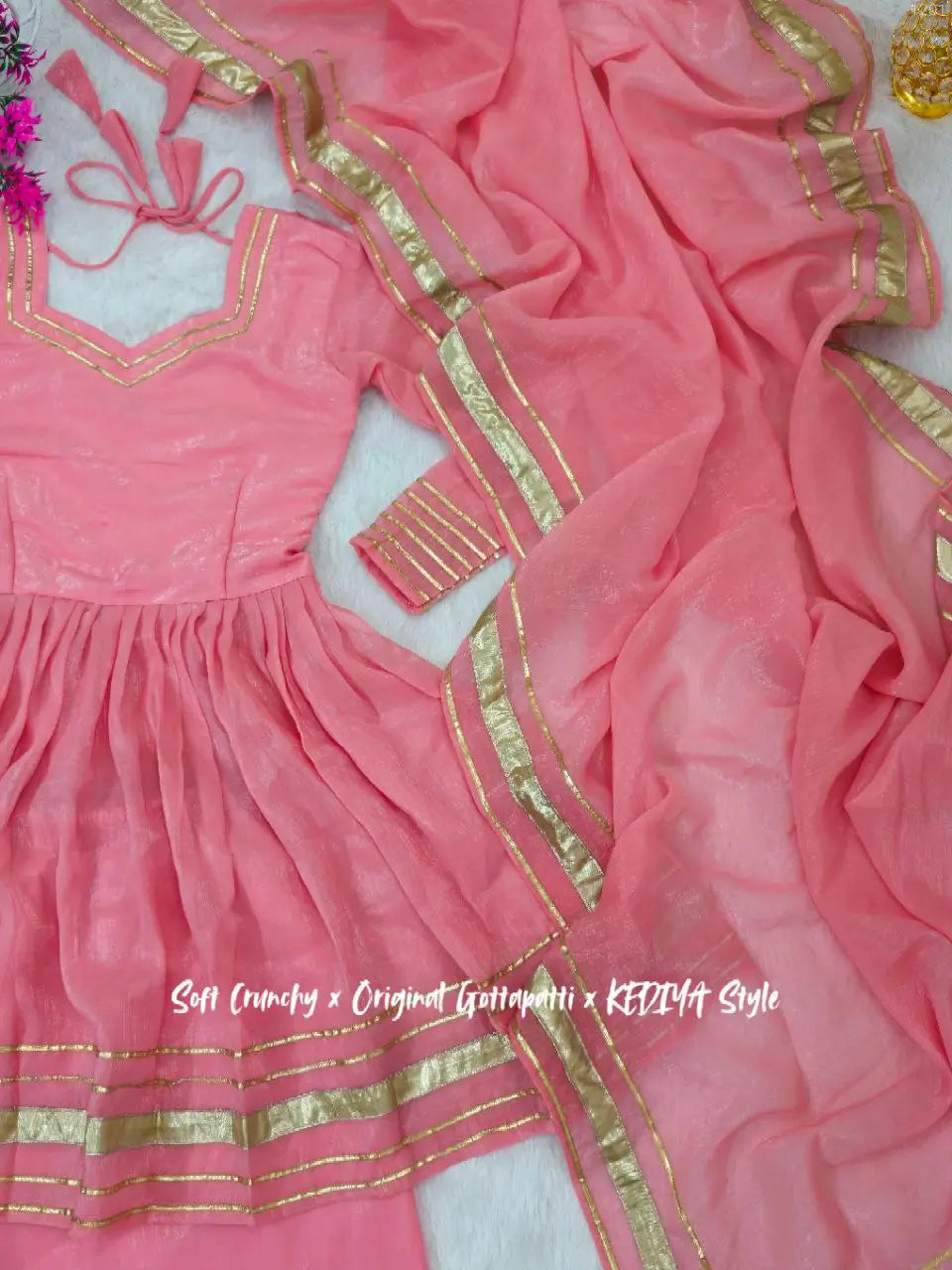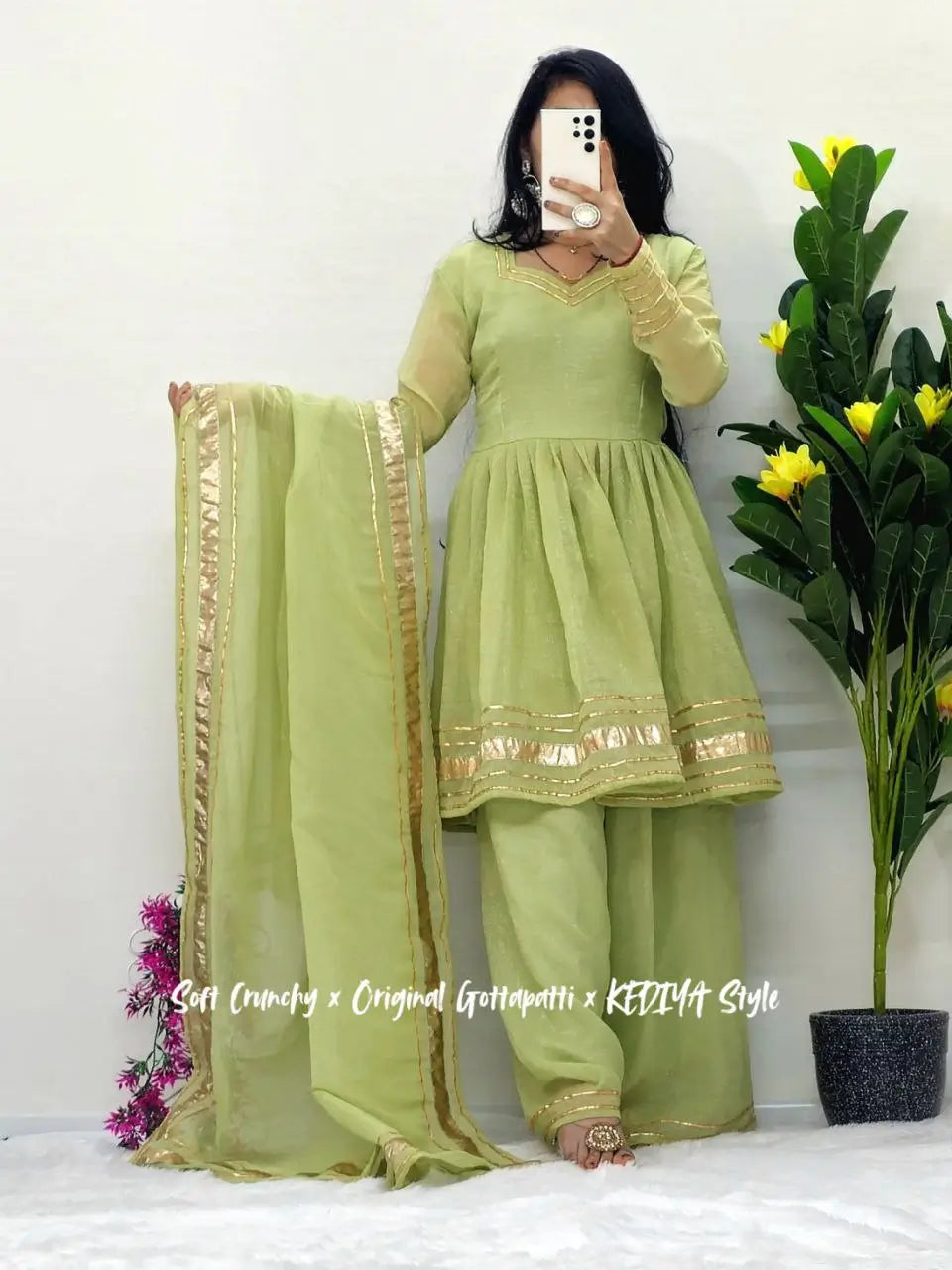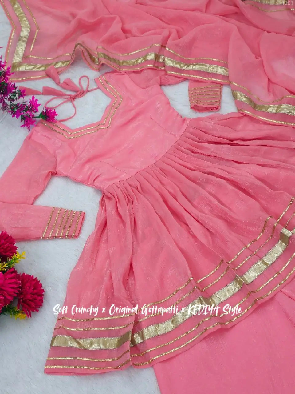 This elegant kurta palazzo set is crafted from 100 percent original shimmering soft crunchy crush fabric, offering a graceful drape with a subtle festive shine. The kurta is beautifully enhanced with eye-catching gota patti touch-up work that adds a rich traditional charm while maintaining a lightweight and flowy silhouette. It is lined with soft cotton inner fabric to ensure comfort throughout the day. The flared kurta creates effortless movement, making it suitable for festive gatherings and special occasions. The matching palazzo is made from premium soft crunchy crush fabric with gota patti work, featuring a fully flared design and an elasticated waist for a comfortable fit. Completing the set is a coordinated dupatta in the same fabric, adorned with elegant gota patti work that elevates the overall look. This ensemble is perfect for festive wear, family functions, and celebratory events.
