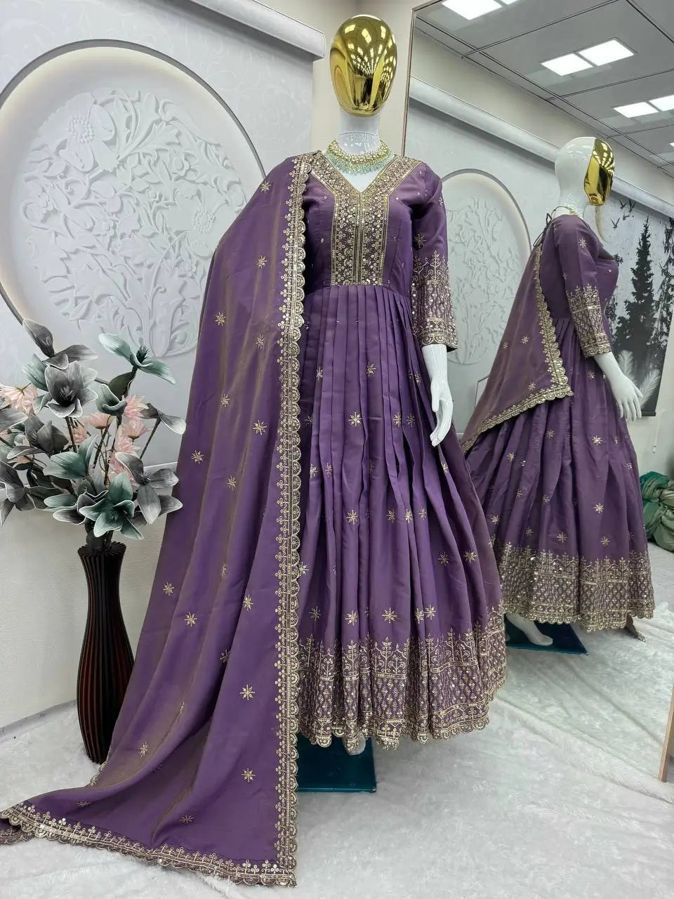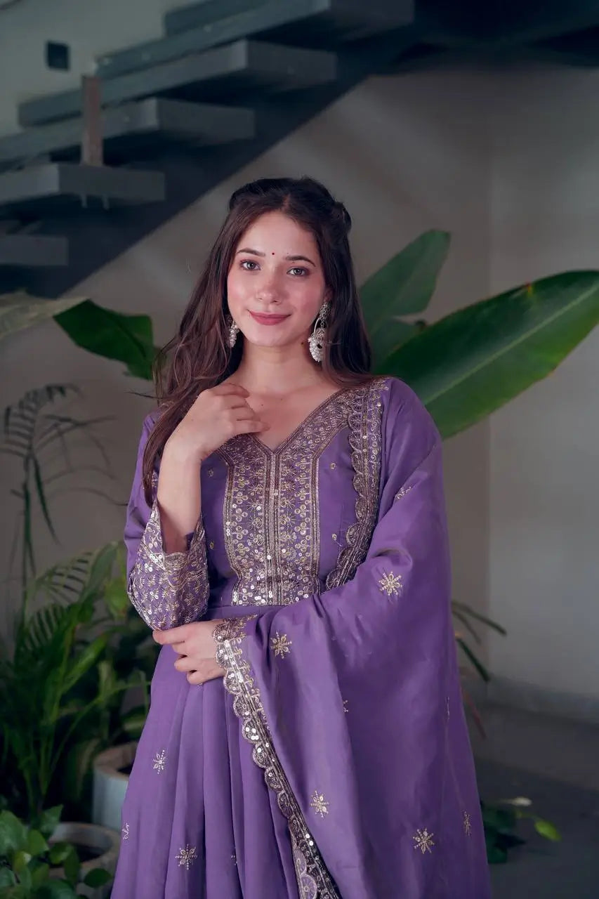 This elegant gown set is crafted from heavy shimmer silk, offering a rich festive sheen and a graceful fall perfect for weddings and celebrations. The gown features intricate embroidery with sequins work on the neckline, sleeves and border, giving it a refined and luxurious appearance. Designed fully stitched with a flattering 3.5 meter flair and a soft micro cotton inner, it ensures comfort along with premium craftsmanship.