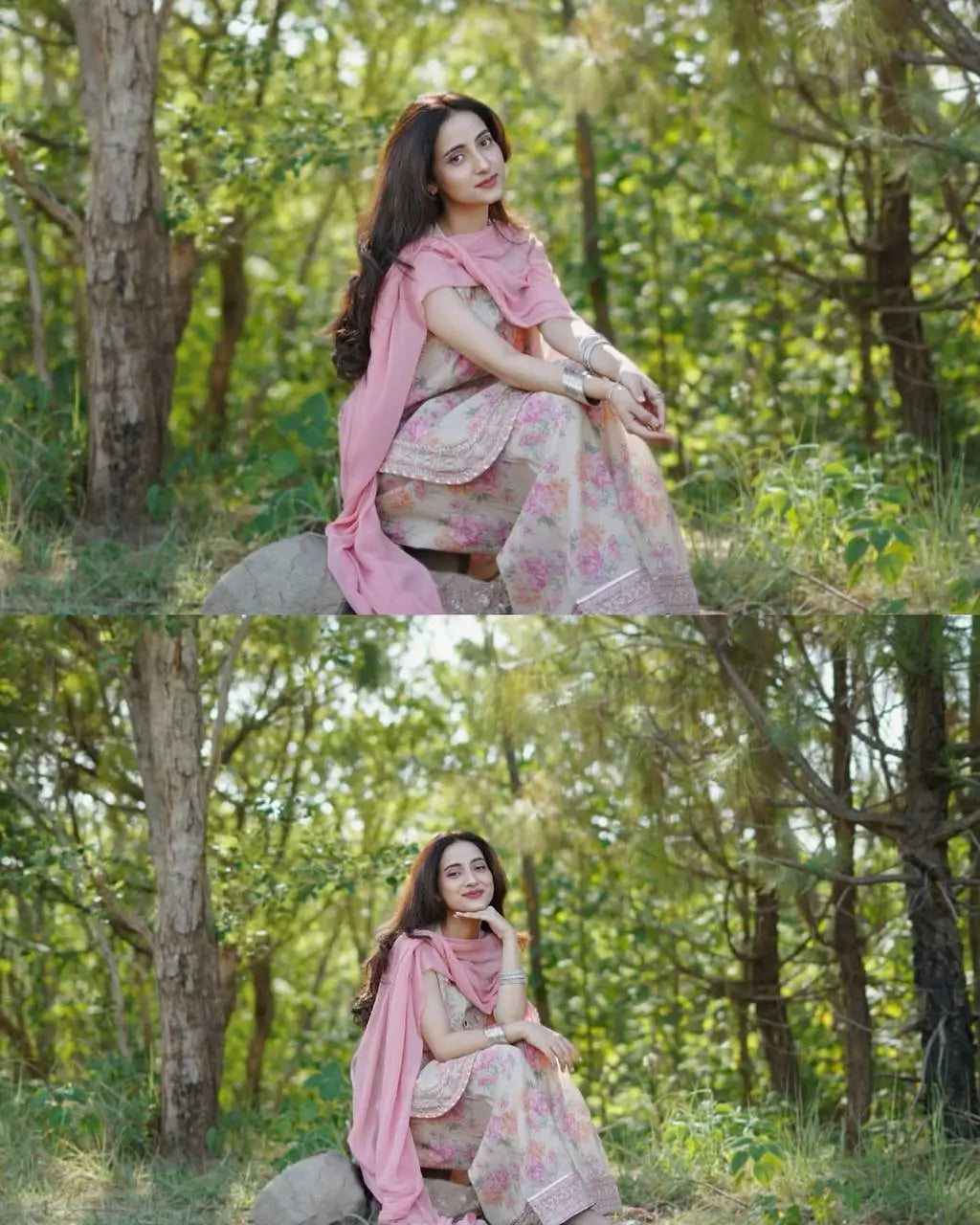 The outfit features a farshi-style palazzo in sifon georgette, combining digital print with sequins embroidery for a regal touch.