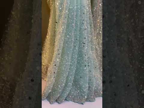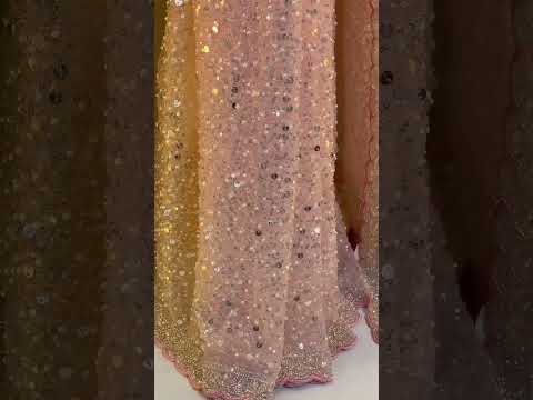 The saree is adorned with exquisite sequins and beads embroidery work spread elegantly across the body, adding a subtle shimmer with every movement. The highlight of this piece is its beautifully crafted scallop border with detailed embroidery, giving it a rich and luxurious finish.