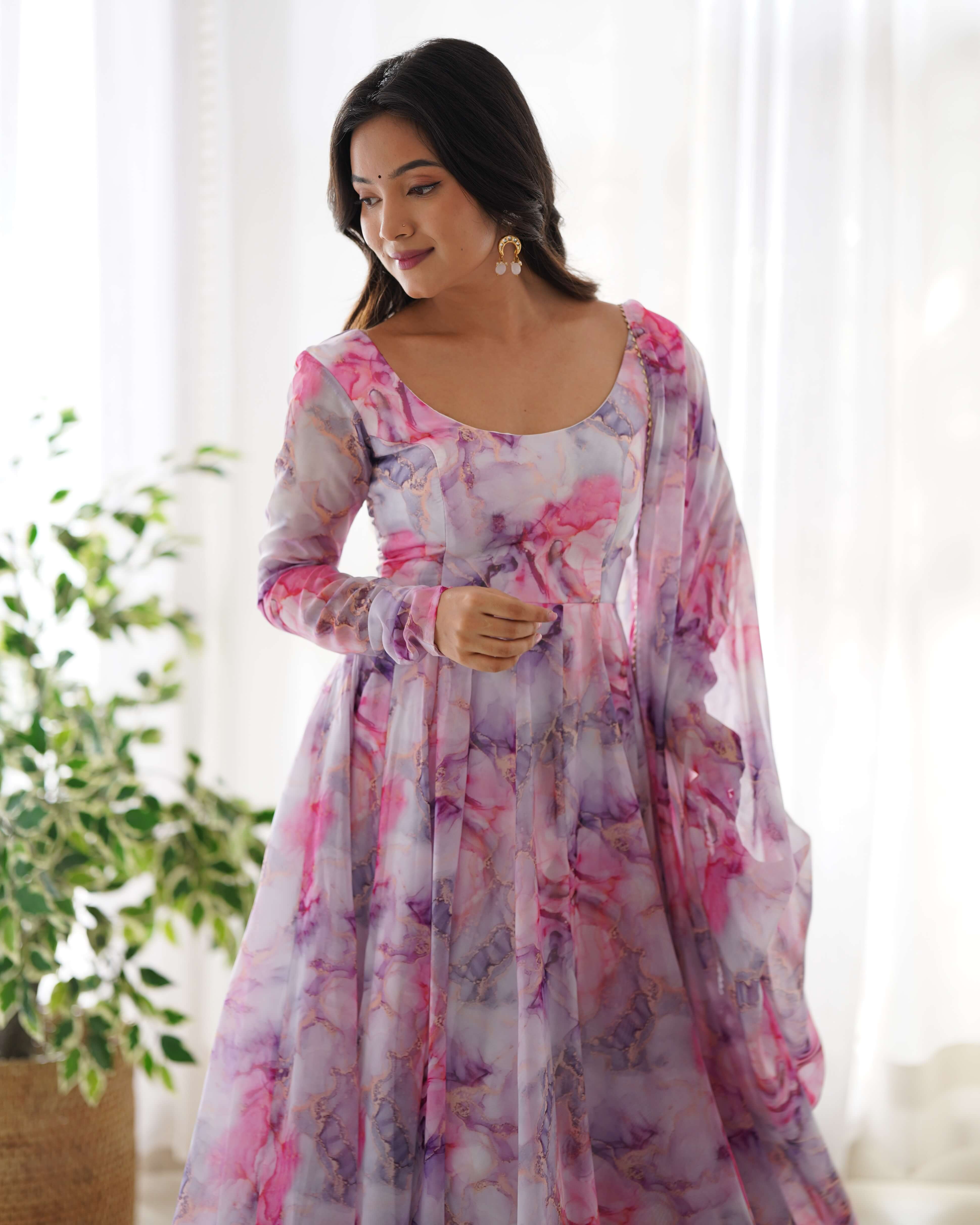 Experience sheer grace and sophistication with this premium Anarkali set crafted from heavy pure soft organza silk. The elegant floral print in dreamy pastel shades brings a soft, feminine charm to your ethnic wardrobe. The Anarkali features a 4-meter flair with attached kali cut and canvas patta for a voluminous and regal drape. Its inner lining in pure micro cotton ensures ultimate comfort and structure for all-day wear.