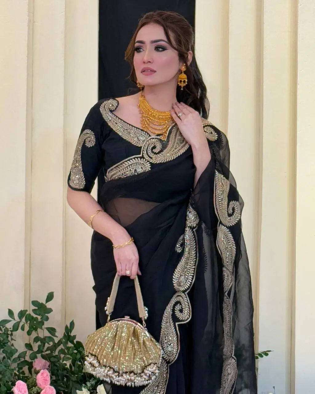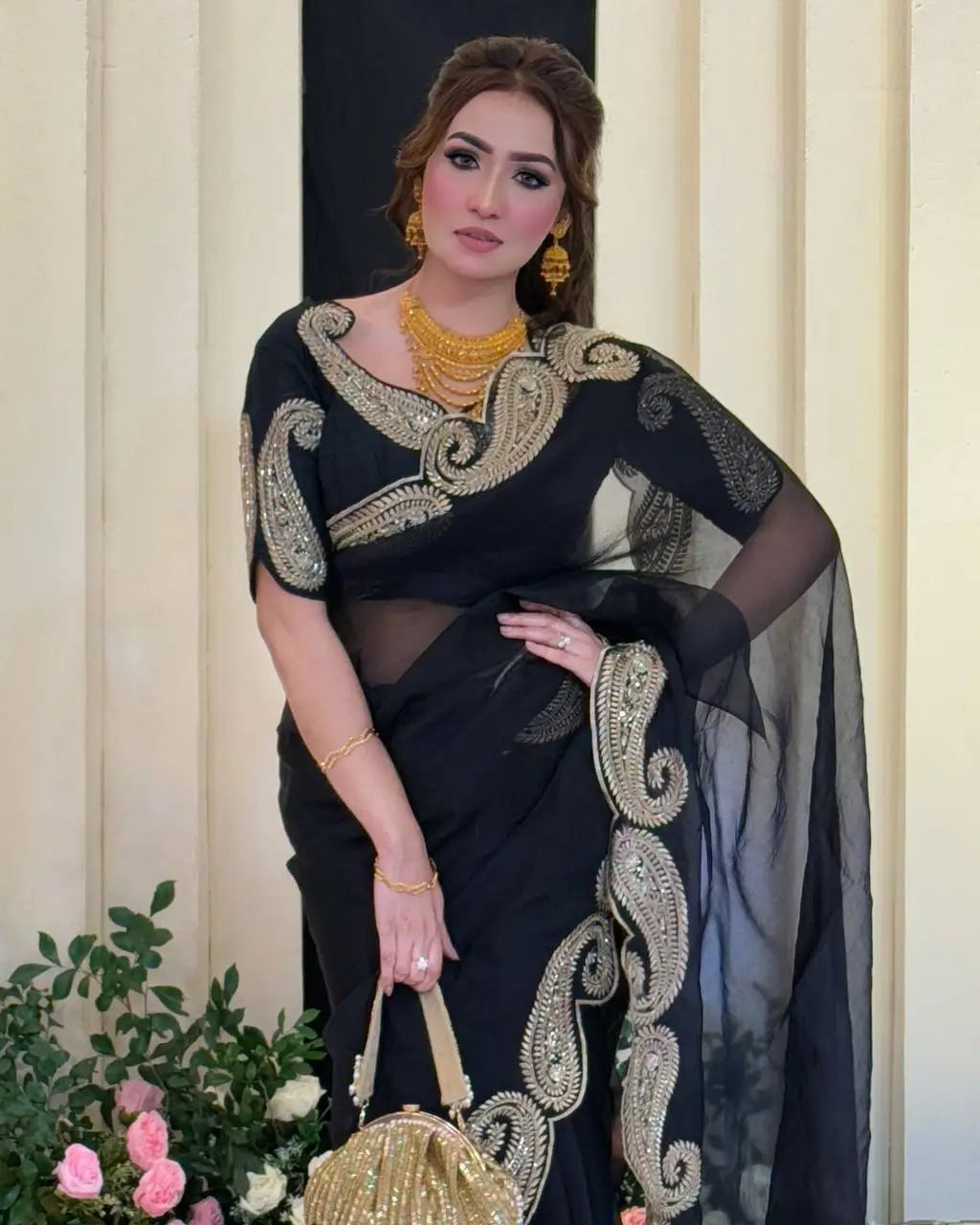 This showroom-quality saree is designed for women who love refined ethnic fashion with a glamorous touch.