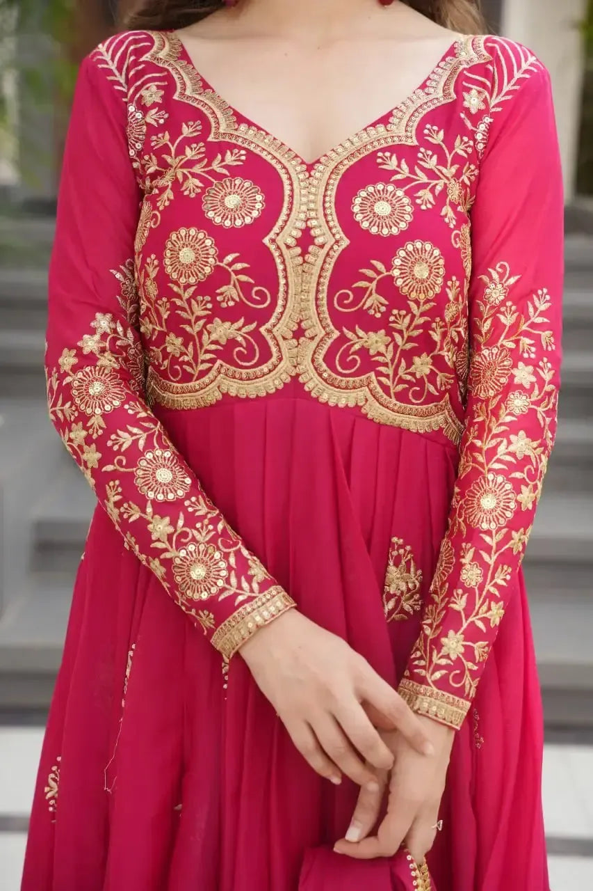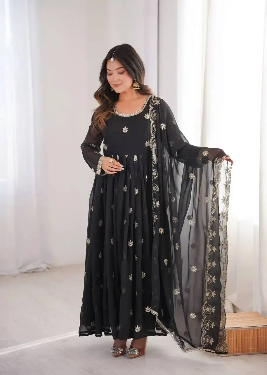 Step into elegance with this luxury star georgette gown, beautifully designed with zari and sequins embroidery. With its 3.5-meter flair and full cotton lining, it combines grandeur with comfort.