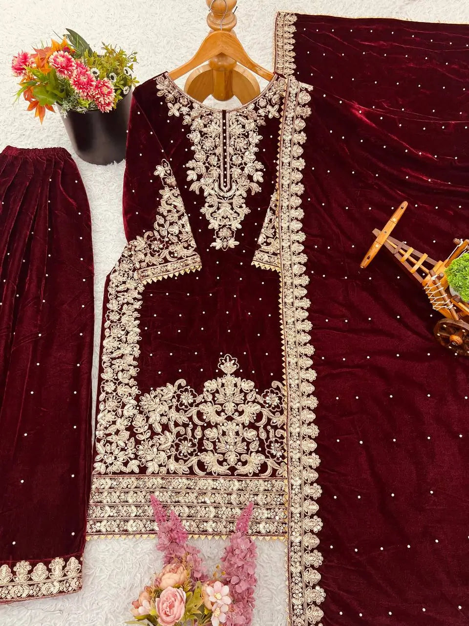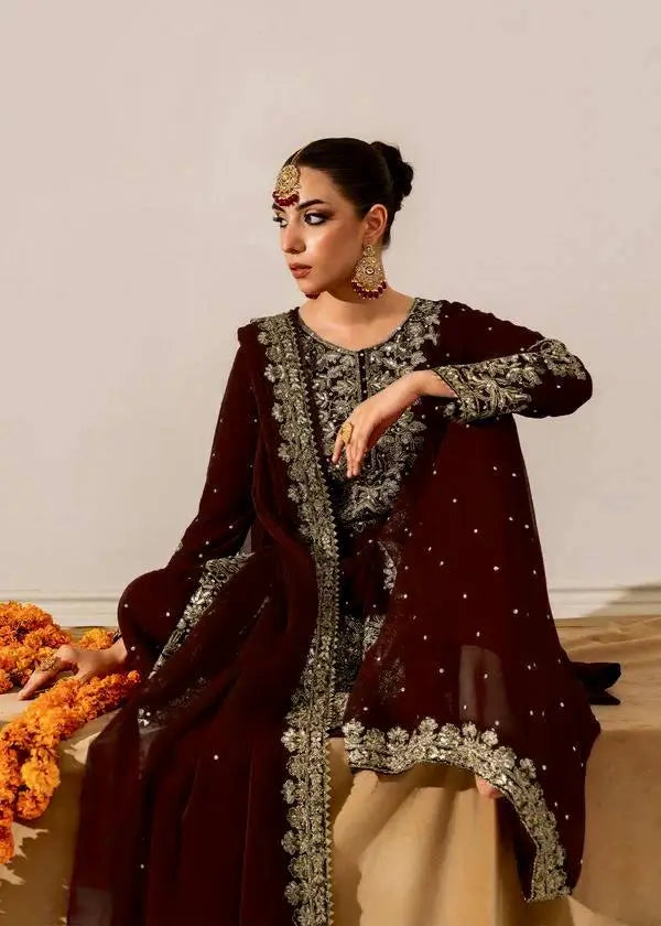 The matching bottom is also crafted from heavy viscose velvet with coordinating embroidery, giving the sharara a rich and voluminous finish. The set includes a beautifully embellished dupatta designed to complement the outfit perfectly. With a fully stitched, ready to wear finish, this suit set brings together premium craftsmanship, comfort, and sophisticated festive charm.