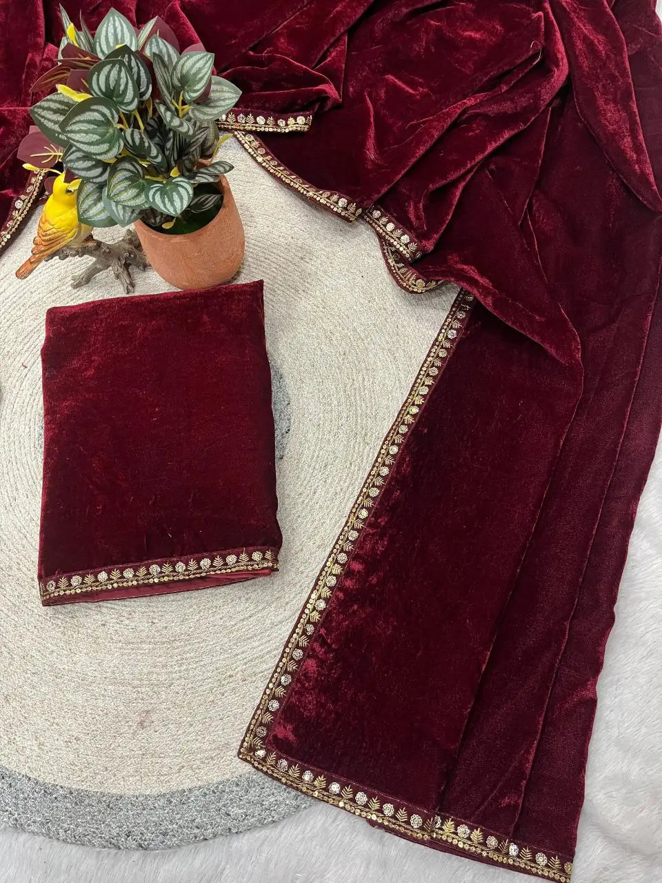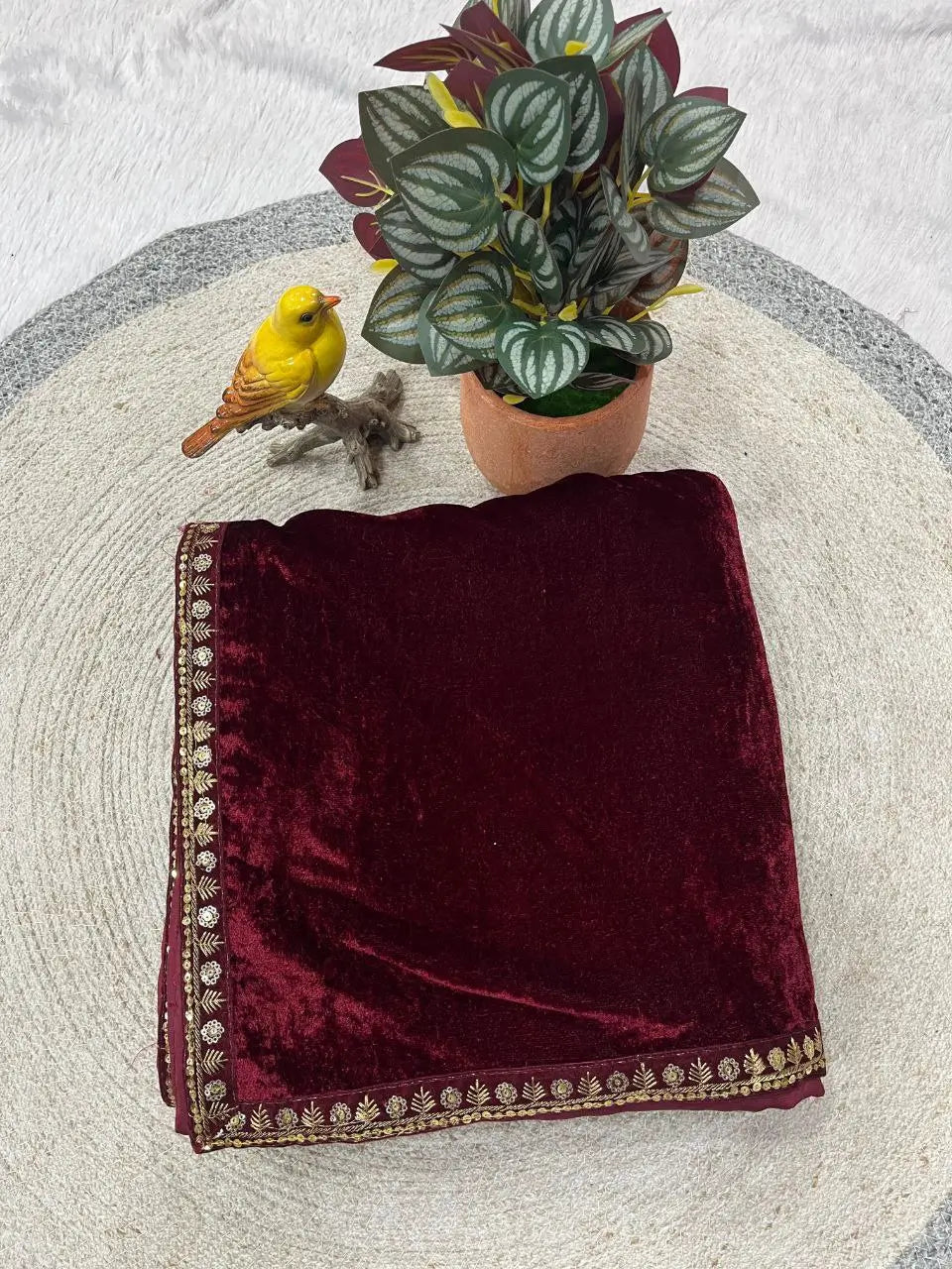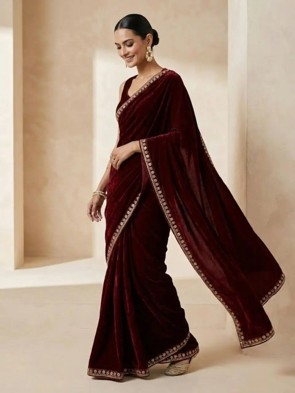 This timeless saree is crafted from premium pure 9000 velvet, offering a rich texture and luxurious drape ideal for evening functions and special occasions. The solid velvet base is elevated with a refined designer lace border featuring dual sequins work in 3 mm and 5 mm sizes, enhanced with delicate zari thread embroidery. The subtle shine of the sequins beautifully contrasts with the deep velvet finish, creating an elegant and sophisticated look. Paired with a matching velvet blouse fabric detailed with the same designer embroidery and sequins lace, this saree is perfect for parties, festive gatherings, and formal celebrations where understated luxury stands out.