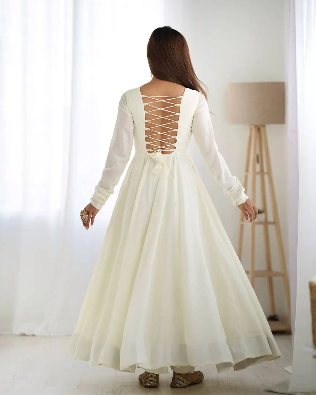 The package includes the Anarkali gown, dupatta, and stitched pant.